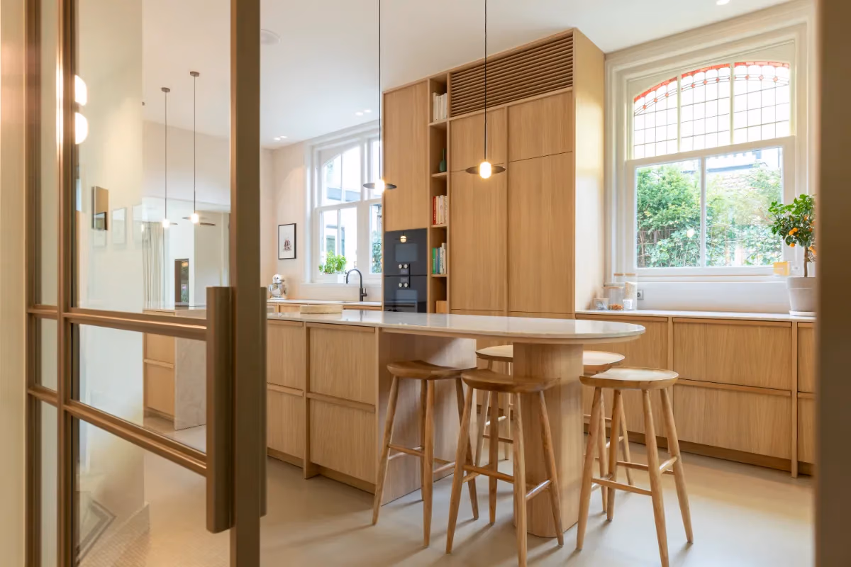 De oase van rust in de japandi keuken wordt gecreëerd door een samensmelting van indeling, licht en materialen. We maken gebruik van verschillende natuurlijke materialen, zoals hout en bamboe. We laten de typische japandi kleurstellingen terugkomen.