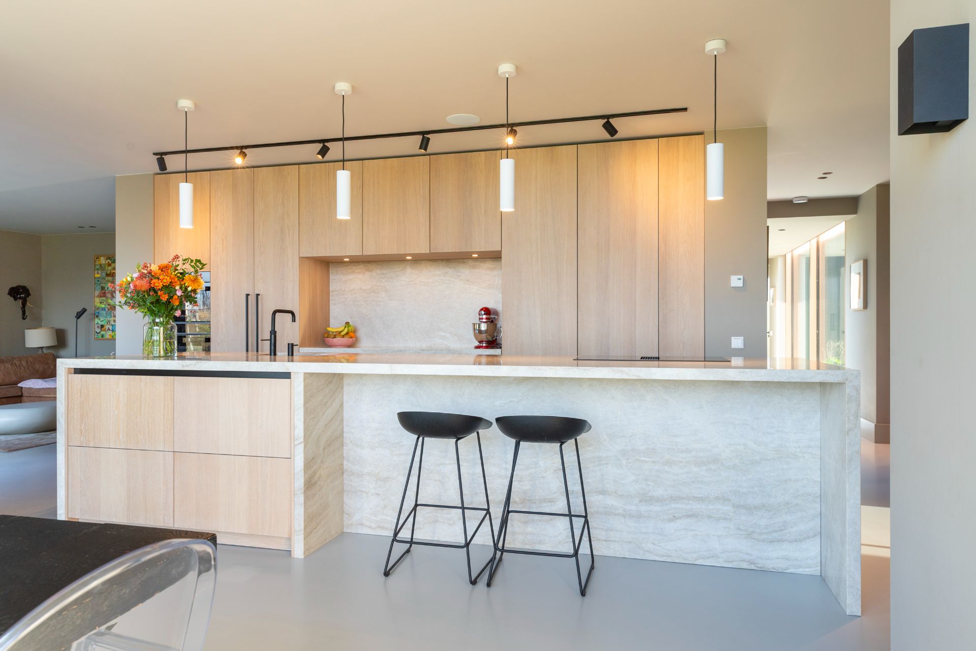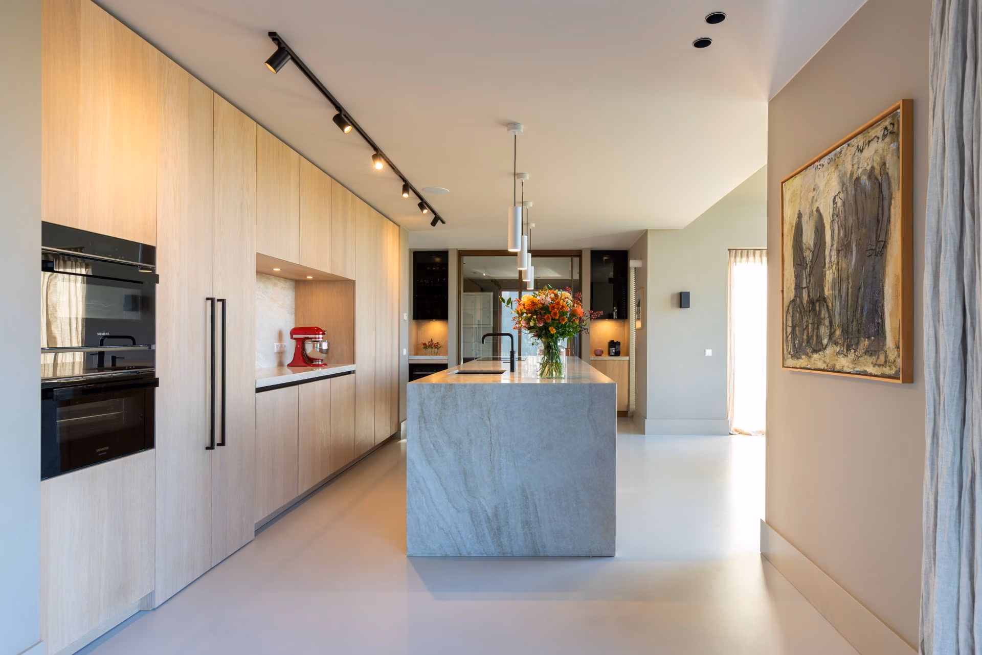 Voor deze woning in Rotterdam ontwierpen we een Japandi keuken waarin rust, eenvoud en natuurlijke materialen centraal staan. De keuken is uitgevoerd in licht eiken met een naturel beits, wat zorgt voor een warme en tijdloze uitstraling. Het kwarsieten werkblad Taj Mahal in crème en zandbruine tinten versterkt het zachte, natuurlijke palet en voegt een verfijnde luxe toe aan het geheel.