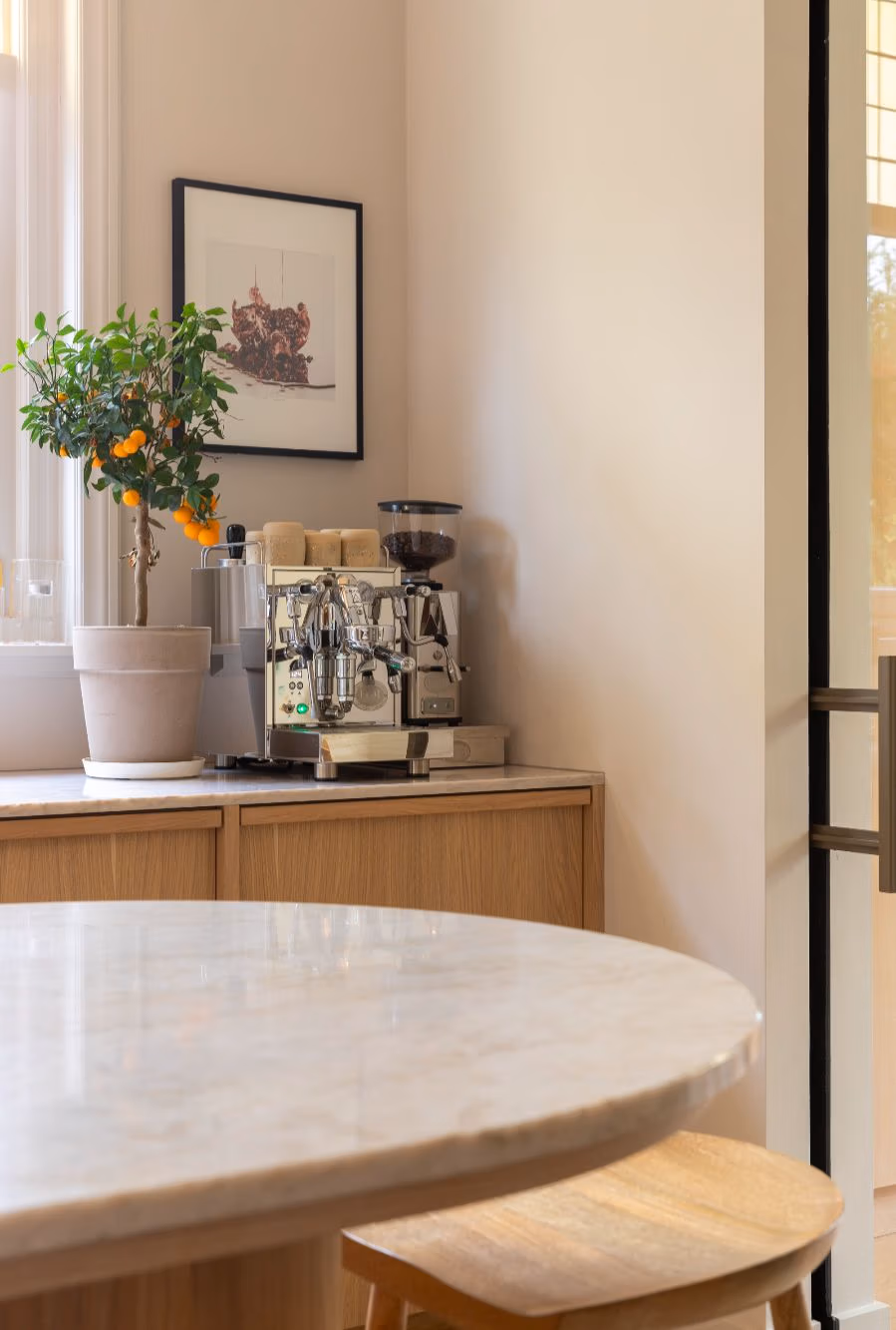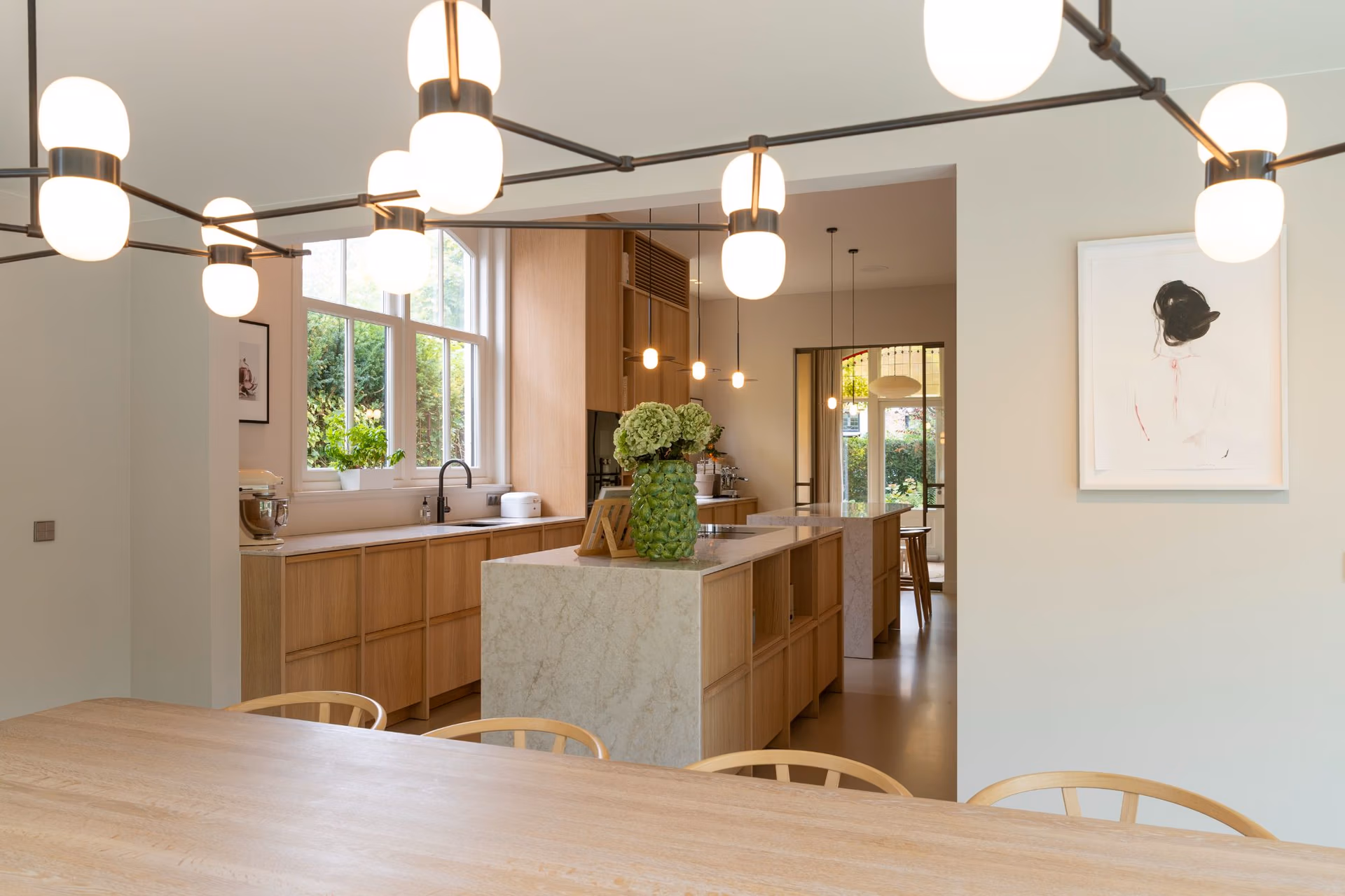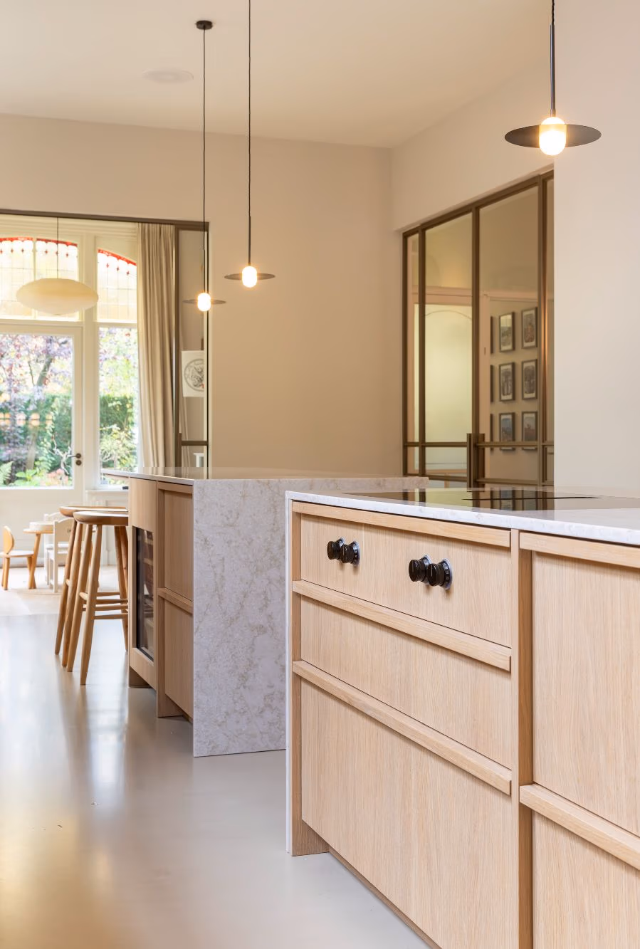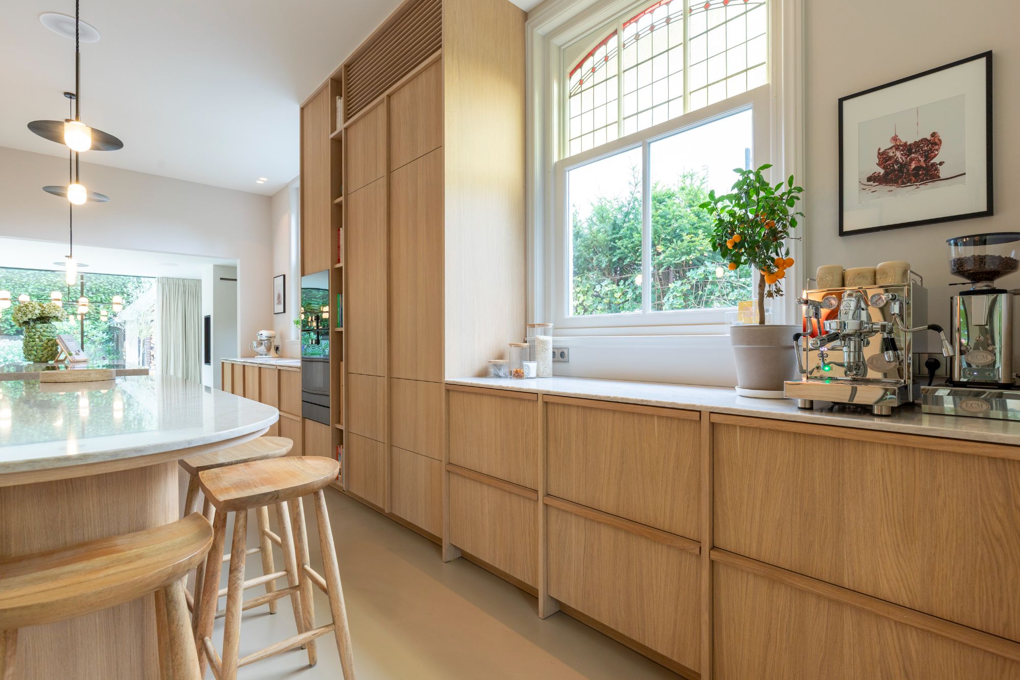 Deze keuken is ontstaan vanuit de specifieke wensen van de bewoners. Een eiken keuken die natuurlijk aanvoelt, gecombineerd met een werkblad dat probleemloos is in dagelijks gebruik. De luxe apparatuur van Gaggenau, sluit daar volledig op aan. Met de uniek verwerkte knoppen, ontstaat er een subtiel maar mooi detail dat aansluit op het rustige en luxe ontwerp van deze keuken.