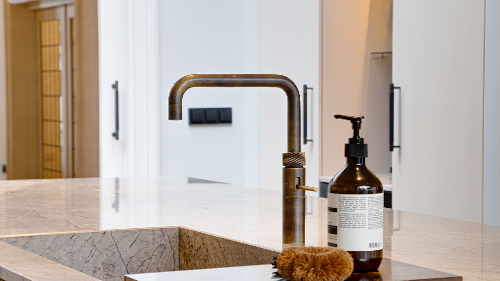Hetgeen zeker niet mocht ontbreken in deze grote keuken is een wijnkoeler. Met de wijnkoeler van Liebherr kunt u op elk gewenst moment een glas wijn serveren op de perfect temperatuur. Ook een kokendwaterkraan van Quooker en een koffie en wijn nis stonden op het wensenlijstje van de familie. Het resultaat mag er wezen; een grote keuken van alle gemakken voorzien.