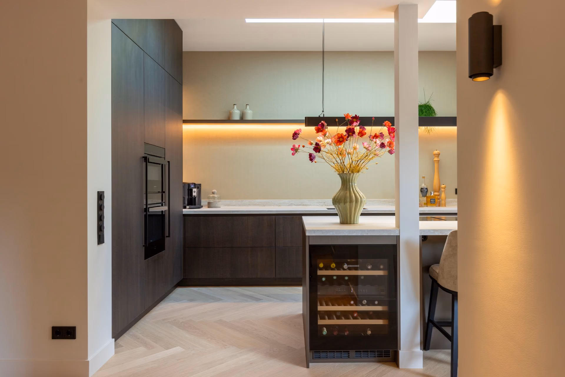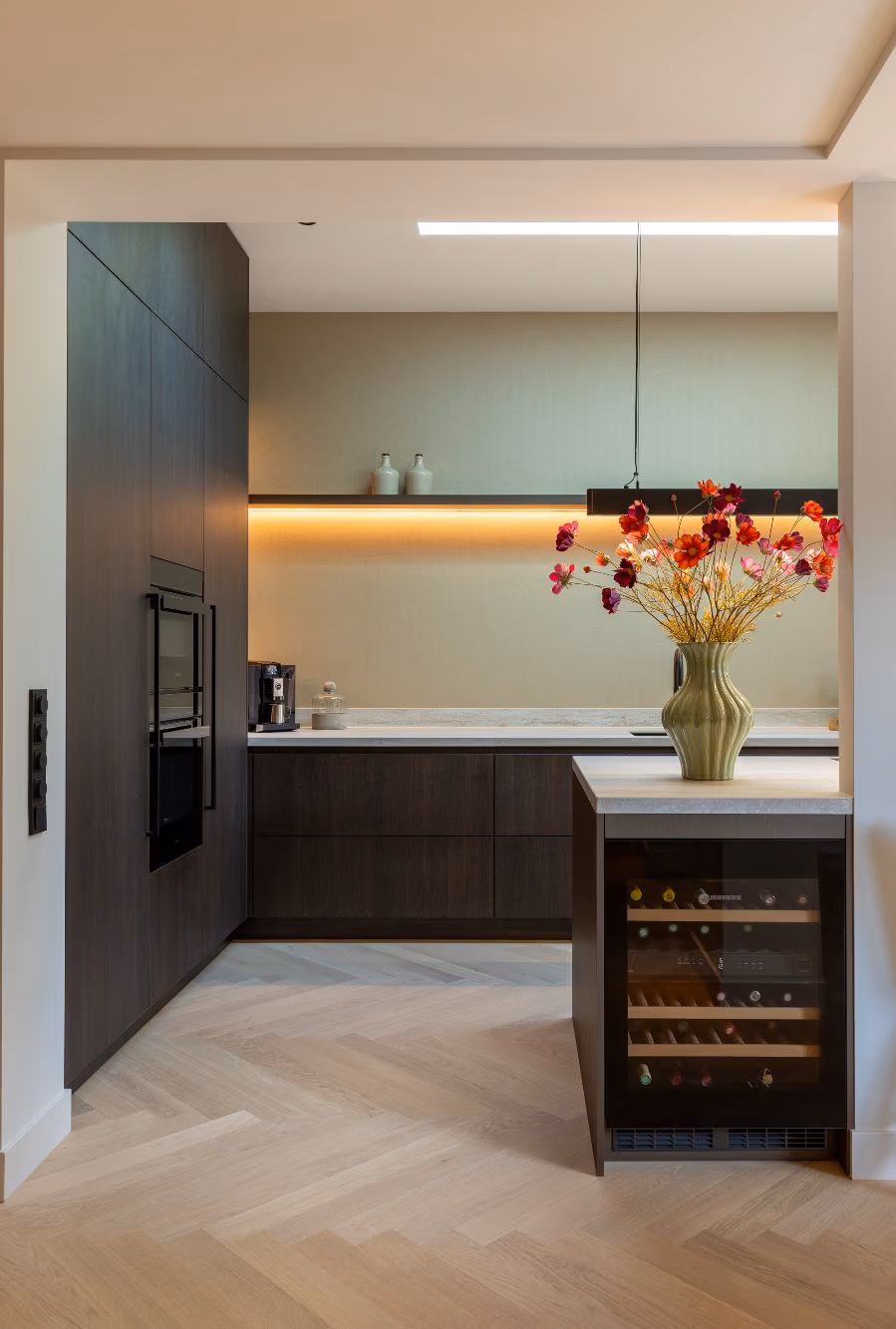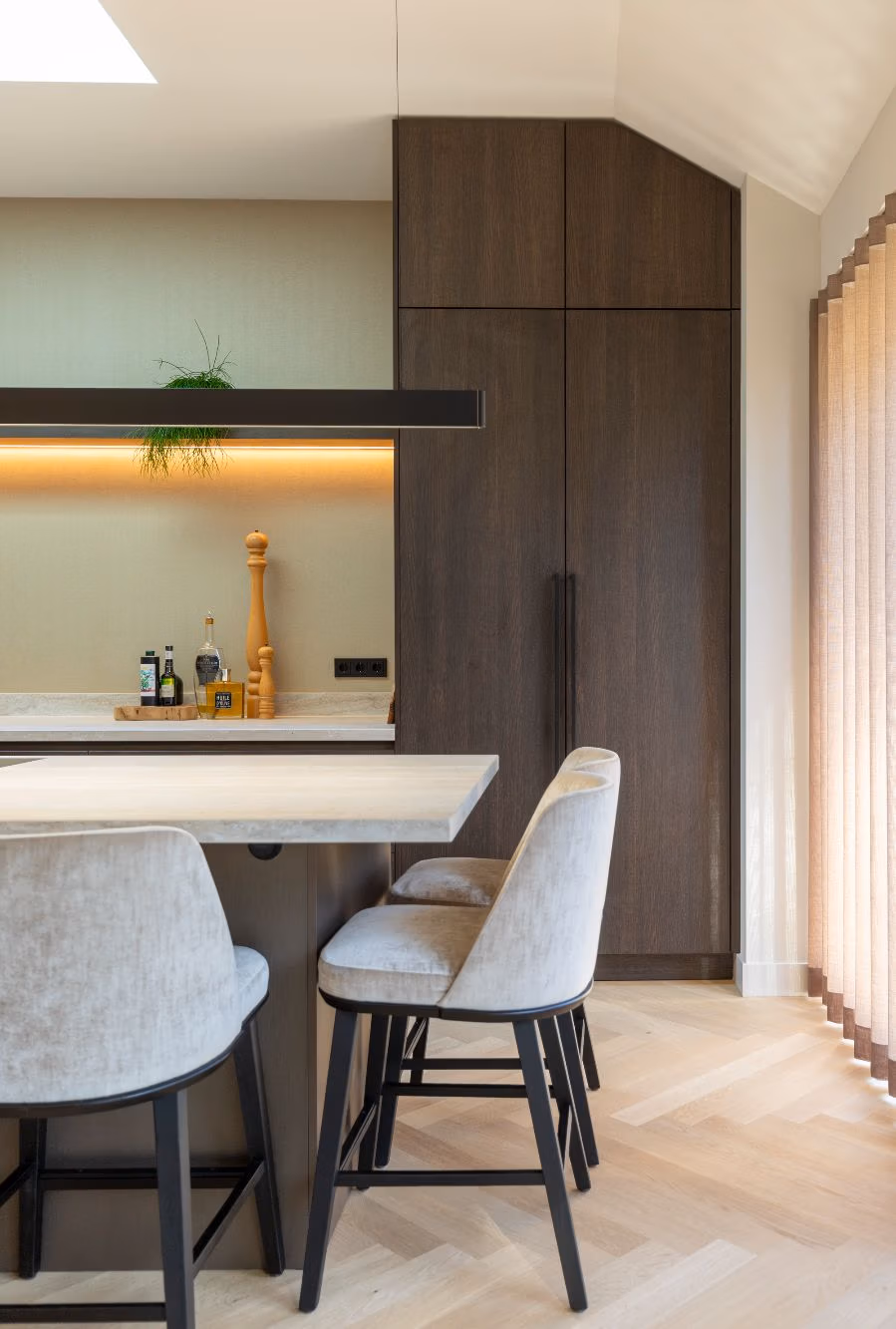 Een van de wensen van de bewoners was een werkblad dat eenvoudig te onderhouden is, maar toch een natuurlijke uitstraling heeft. Keramiek maakt dit mogelijk. Het materiaal heeft een hoge hardheid, is hitte- en krasbestendig en blijft ook bij dagelijks gebruik prachtig. De travertin-look van het werkblad voegt daarbij een natuurlijke textuur toe, die doet denken aan echt natuursteen.